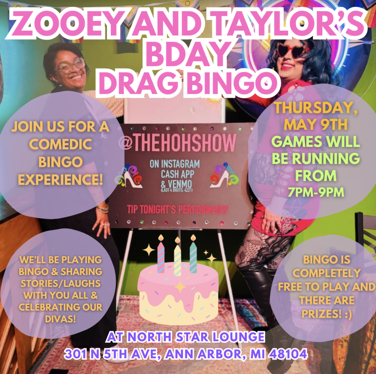 LGBTQ Night: ZOOEY & TAYLOR’S B-DAY DRAG BINGO Thursday, May 9, 2024 7:00 PM 9:00 PM North Star Lounge 301 North 5th Avenue Ann Arbor, MI, 48104 United States (map) Google Calendar ICS Make friends, have fun, win prizes! Join us for a comedic bingo experience, hosted by Zooey and Taylor from the Heads over Heels Show. Celebrate Zooey’s birthday-month!