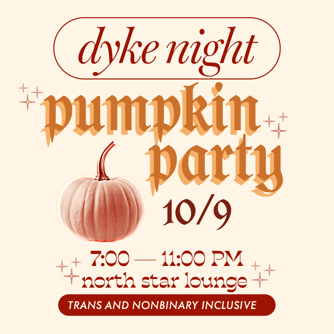 The summer temps are really lingering, but we're leaning on into cozy spooky October anyway with a pumpkin party Dyke Night! Bring your own pumpkin, and North Star will provide supplies for painting or carving :) We'll have the usual setup of drinks & snacks at the bar, and mingling indoors and out. Pumpkin crafting will be out on the patio!